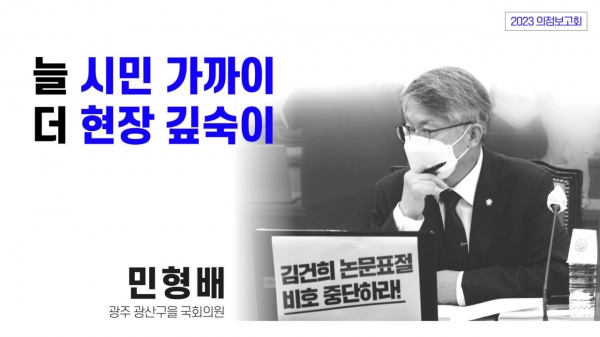 21일 민형배 의원실에 따르면 이번 의정보고회는 ‘늘 시민 가까이, 더 현장 깊숙이’를 주제로 진행되며 지난 3년 동안의 의정과 ‘정무위·법사위·교육위’ 활동의 성과를 지역민들과 공유하는 자리다.