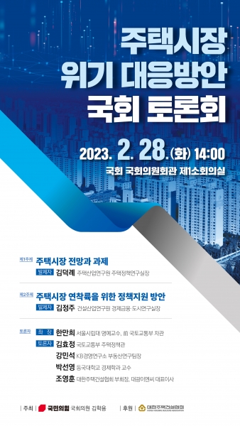 김학용 의원이 주최하고 대한주택건설협회가 후원하는 본 토론회에서는, ‘주택시장 전망과 과제’를 주제로 주택산업연구원 김덕례 주택연구실장이 제1주제 발표를 맡았으며 ‘주택시장 연착륙을 위한 정책지원 방안’에 대해 건설산업연구원 김정구 경제금융·도시연구실장이 제2주제를 발표할 예정이다.