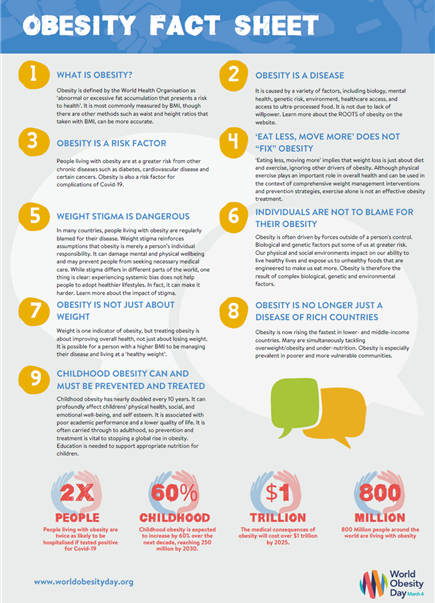세계비만연맹은 ‘세계 비만의 날’을 계기로 비만에 대한 올바른 정보를 제공하고 관점을 전환하는 유일한 방법이 ‘소통’이므로 정책 입안자, 전문가, 일반 대중 간의 대화 등 모든 소통이 중요함을 강조했다.