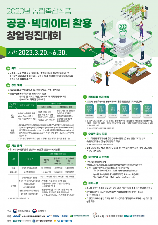 [Q뉴스] 농림축산식품부는 농촌진흥청 등 농림축산식품 관계기관과 함께 3월 20일부터 6월 30일까지‘2023년 농림축산식품 공공·빅데이터 활용 창업경진대회’를 개최한다.
