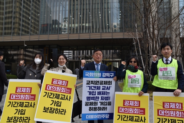 이어서 강득구 의원은 금일 기자회견 후 오후 12시 30분, 한국교직원공제회관 앞에서 기간제 교사의 가입을 촉구하는 시위를 진행했다.