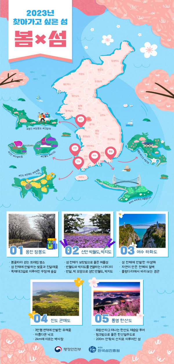 봄섬으로 선정된 5곳에 대한 여행정보는 한국관광공사에서 운영하는 누리집 ‘대한민국 구석구석’에서 확인할 수 있다.