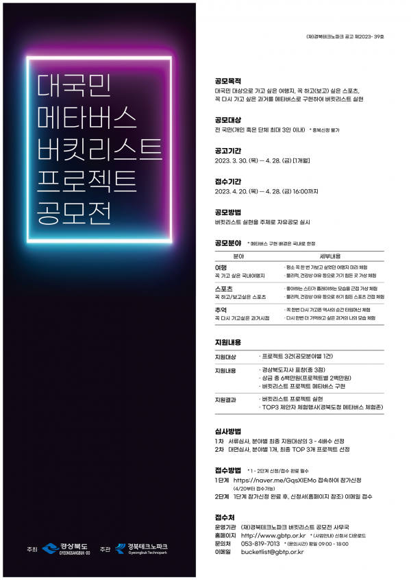 한편 공모전에 대한 자세한 사항은 경상북도 홈페이지 또는 경북테크노파크 홈페이지 공고문을 통해 확인 가능하다.