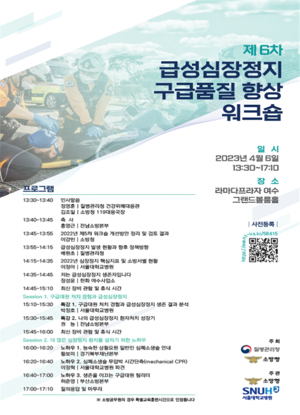 [Q뉴스] 소방청과 질병관리청은 4월 6일 전남 여수에서 ‘제6차 급성심장정지 구급품질 향상 워크숍’을 개최한다고 밝혔다.