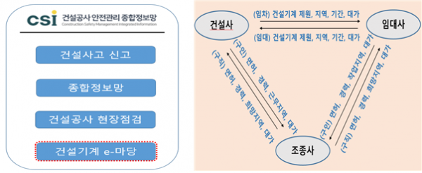 ‘건설기계 e-마당’은 건설안전종합정보망에 구축됐으며 기존 가입한 건설사 등은 회원가입 없이, 건설기계 임대사·조종사는 회원가입을 통해 건설기계 임차, 임대 및 조종사 구인·구직 정보 등을 휴대폰·컴퓨터로 무료 검색·신청할 수 있다.
