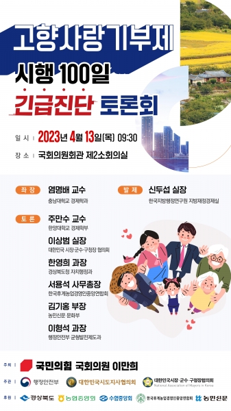 이어 “고향사랑기부제 촉진을 통한 지방소멸 위기극복의 실질적 개선책을 마련하기 위해 오늘 국회 의원회관에서 민·관 합동 토론회를 개최했다”며 “고향사랑기부제 주무부처인 행정안전부와 실무부처인 전국 지차제를 소관하는 국회 행정안전위원회 국민의힘 간사위원으로서 제도개선을 위해 정책적·입법적 지원에 최선을 다할 것”이라 각오를 전했다.
