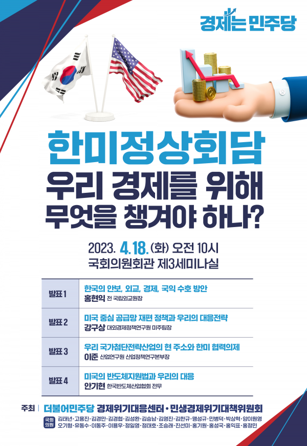 더불어민주당 경제위기대응센터와 민생경제위기대책위원회는 4월 18일 오전 10시 국회의원회관 제3세미나실에서 ‘한미정상회담, 우리 경제를 위해 무엇을 챙겨야 하나?’를 주제로 세미나를 개최한다.