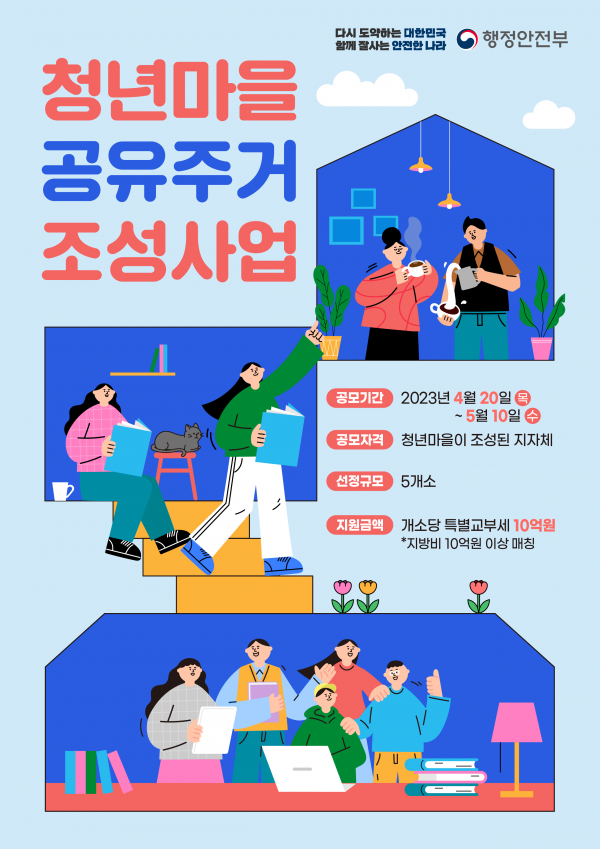 [Q뉴스] 행정안전부는 청년마을이 조성된 36개 지역을 대상으로 청년들의 보금자리를 조성하는 ‘2023년 청년마을 공유주거 조성사업’을 공개 모집한다고 밝혔다.