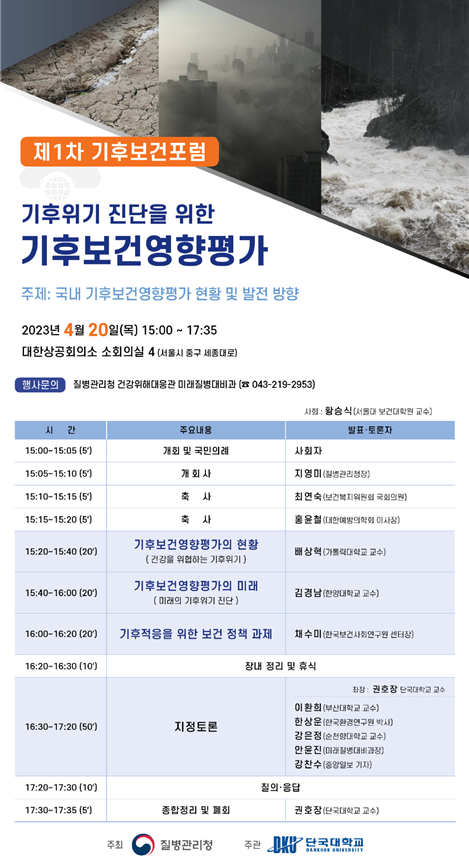 이번 기후보건포럼은 질병관리청이 시행하고 있는 기후보건영향평가의 활용성 강화를 위해 전문가의 의견을 수렴하고 미래 기후위기 진단을 위한 발전 방안을 다각도로 논의하기 위해 마련했다.