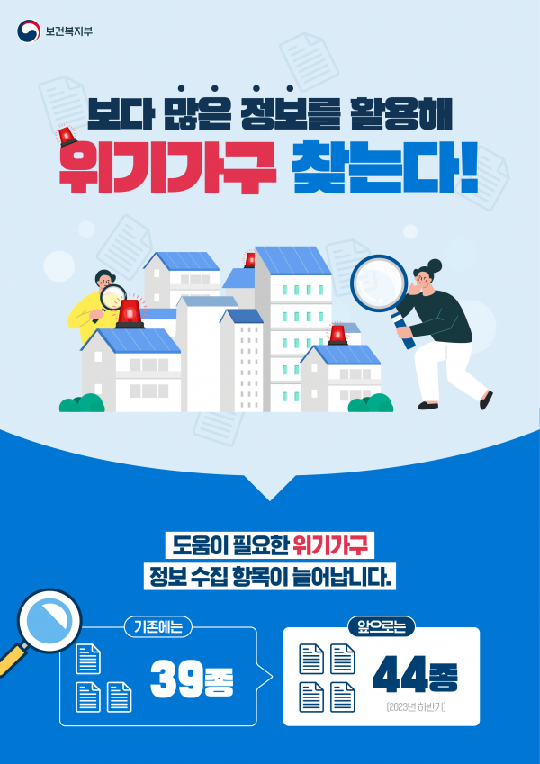 ‘23년 12월부터는 복지 사각지대 발굴을 위해 처리하는 정보가 39종에서 44종으로 확대된다.