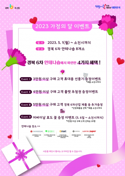 [Q뉴스] 경상북도는 5월 1일부터 31일까지 ‘농업 6차산업 안테나숍 8개소’에서 “2023년 가정의 달 맞이 특판전”을 개최한다고 밝혔다.