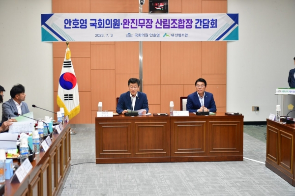 안호영 의원은 “완진무장 임업인들 소득증대 대책을 마련하는 자리에 먼 길을 달려온 최창호 산림조합 중앙회장에게 감사의 인사”를 표하며 “산림조합 숙원사항을 청취하고 산림정책 관련 애로사항이나 건의사항을 적극적으로 논의하기 위해 산림조합중앙회 뿐 만 아니라 전북도의회, 완진무장 군의회가 모두 한자리에 모이게 됐다”며 간담회 취지를 밝혔다.