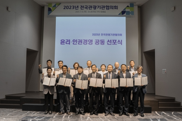 [Q뉴스] 한국관광공사와 전국 15개 지역관광공사·관광재단 협의체인 ‘전국관광기관협의회‘는 오늘 경기도 고양 소노캄호텔에서 ’윤리·인권경영 공동 선포식‘을 개최했다.