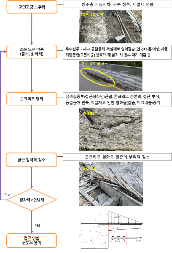 점검과정에서 포장 균열, 캔틸레버 끝단 처짐, 동결융해로 인한 균열, 파손, 슬래브 하면 백태 및 우수유입 증가 등이 관측 보고되었으나, 이에 대한 원인분석과 관련 구조적 특성을 고려한 적시의 보수·보강 조치도 미흡했다.