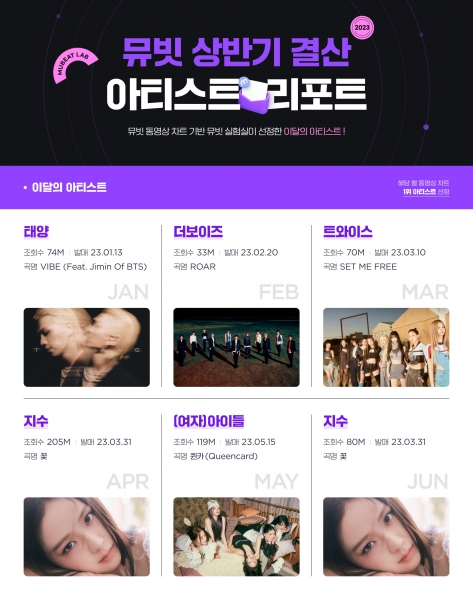 뮤빗에 따르면 2023년 상반기 월별 최고 뮤직비디오 조회 수를 기록하며 ‘이달의 아티스트’에 등극한 K팝 아티스트는 YG 소속 그룹 빅뱅의 ‘태양’과 블랙핑크의 ‘지수’, 막강한 팬덤을 보유한 대표 보이그룹 ‘더보이즈’, 이제는 그룹 자체가 하나의 아이콘이 된 걸그룹 ‘트와이스’,’(여자)아이들’이다. 이들은 모두 꾸준함과 과감한 시도를 통해 최고의 성적을 거뒀다.