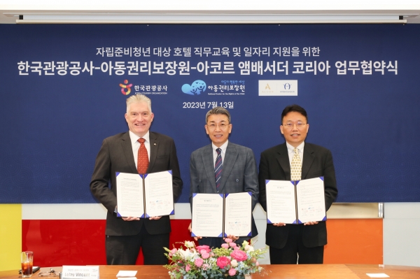 [Q뉴스] 한국관광공사는 13일 공사 서울센터에서 아동권리보장원, 아코르앰배서더코리아와 함께 자립준비청년대상 호텔서비스 교육과 취업 지원을 위한 업무협약을 체결했다.