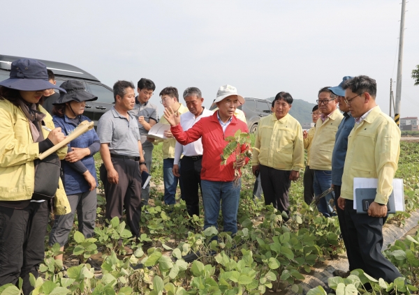 박덕흠 위원장은 논콩의 주산지인 괴산군 불정면에서 장맛비가 주춤한 사이 고온 다습한 날씨가 이어지면서 각종 병해충 초기 증상이 발생한 것을 확인하고 해당 농가들에 신속한 방제작업이 필요하다고 판단했다.