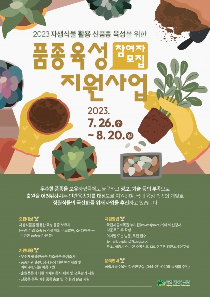 국립세종수목원이 추진하는 품종육성 지원사업은 우수한 품종을 보유하고 있으나 정보, 기술 등의 부족으로 품종 출원이 어려운 개인 육종가 또는 소규모 사업체를 지원하는 제도이다.
