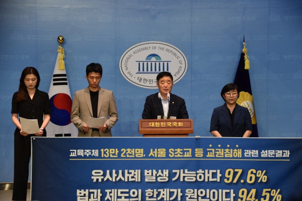 [Q뉴스] 국회 교육위원회 소속인 강득구 의원 과 교육정책디자인연구소는 28 일 오전 9 시 40 분 , 국회 소통관에서 기자회견을 열고 ‘ 서이초 사건 등 교권침해 관련 교육주체 13 만 2,359 명 설문조사 결과 ’ 를 발표했다.