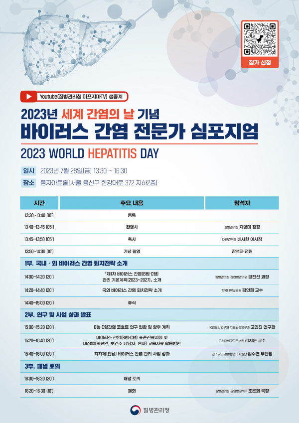 이번 행사는 대한간학회, 시·도 감염병관리지원단 등 관련 기관 및 지자체 담당자 등 100여명이 대면으로 참여할 예정이며 질병관리청 누리소통망 유튜브 채널을 통해서도 생중계된다.