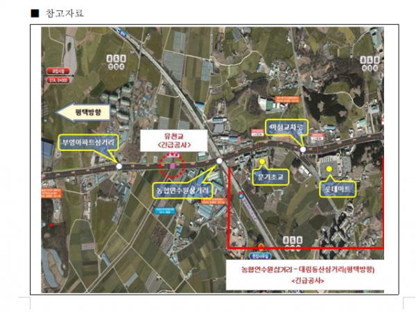 긴급공사는 현재 농협연수원 삼거리 인근 유천교 가설을 위해 우회도로를 설치해 운영중이나, 지속적인 차량사고 발생 및 우기시 하천 범람 등의 위험이 예상돼 조속히 교량을 가설하고 우회도로를 철거한다.