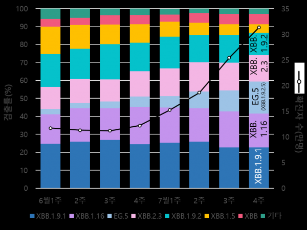 XBB.1.9.1의 검출률은 22.7%로 20%대 초중반 유지 중이고 XBB.1.9.2의 세부계통인 EG.5는 17.8%로 지속 증가 추세, XBB.1.16과 XBB.2.3은 18.8%, 14.8%로 전주 대비 소폭 감소했다.