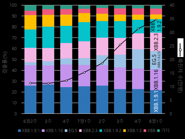 XBB.1.9.2의 하위변이인 EG.5는 8월1주 16.8%로 지속적인 증가세를 보이고 있다.
