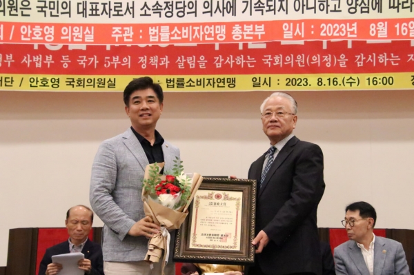 더불어민주당 김병욱 국회의원은 16일 법률소비자연맹이 주최한 ‘제21대 국회 의정활동종합평가회 및 대한민국 헌정대상 시상식’에서 ‘대한민국 헌정대상’을 수여받았다.