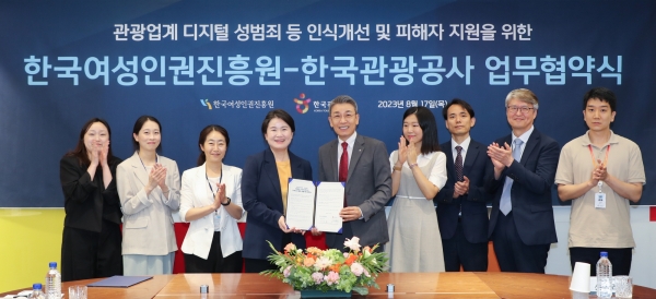 [Q뉴스] 한국관광공사와 한국여성인권진흥원은 8월 17일 공사 서울센터에서 디지털 성범죄 등 여성 폭력에 대한 인식을 개선하고 피해자 지원을 위한 협력관계를 구축하기 위해 업무협약을 체결했다.