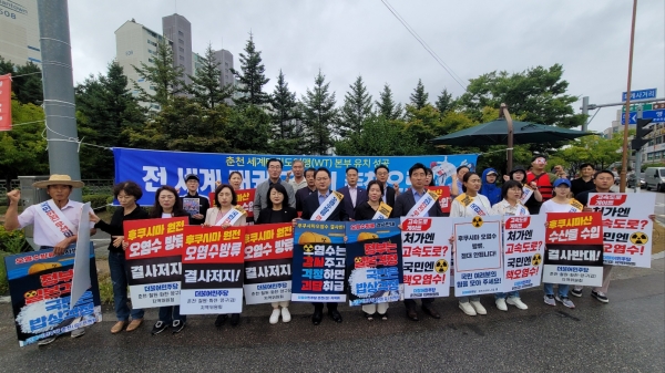 [Q뉴스] 더불어민주당 춘천·철원·화천·양구 지역위원회는 24일 오전 출근시간대에 퇴계사거리 앞에서 후쿠시마 원전오염수 해양방류를 규탄하는 기자회견을 개최했다.