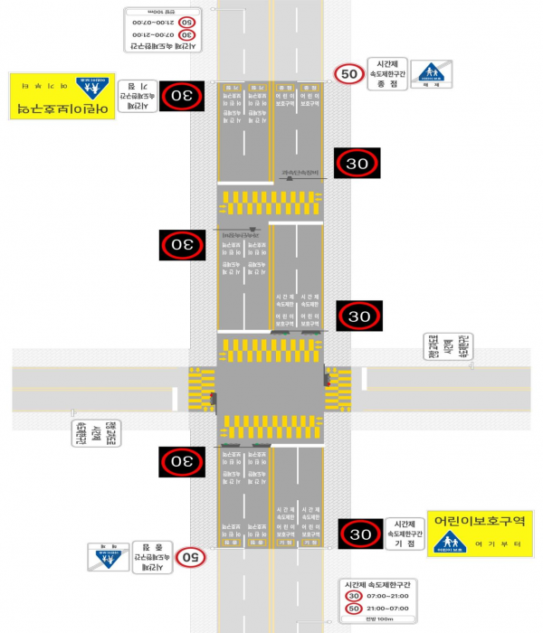 구체적으로 간선 도로상에 있는 어린이보호구역에 대해 국민 불편 해소를 위해 어린이 사고 및 통행이 적은 심야시간 제한속도를 30km/h에서 40~50km/h로 운영하고 제한속도 40~50km/h로 운영 중인 어린이보호구역은 등하교 시간대 어린이 교통안전을 위해 30km/h로 합리적으로 조정한다.