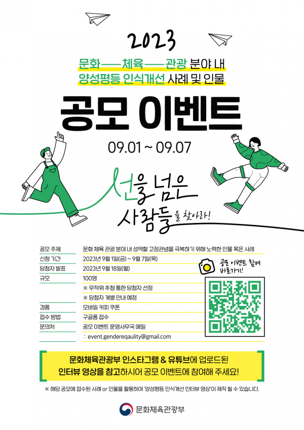 아울러 문체부는 문화·체육·관광 분야에서 성역할 고정관념을 극복하기 위해 노력하고 있는 인물과 사례를 발굴, 소개하는 대국민 온라인 캠페인 ‘선을 넘은 사람들’을 9월 1일부터 7일까지 진행한다.
