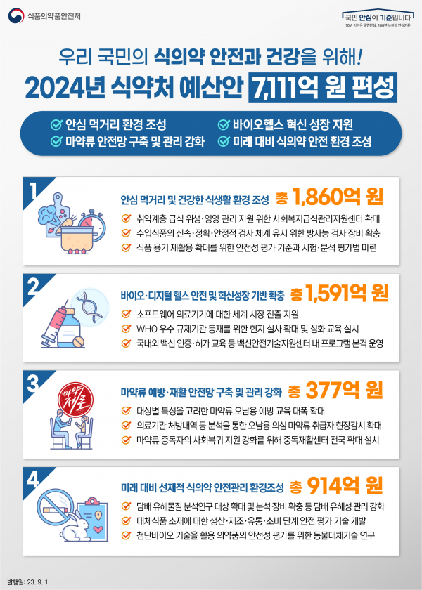 식약처는 2024년 예산안이 국회 심의과정을 거쳐 확정되면 ‘안심 먹거리 환경조성과 바이오헬스 혁신성장 지원’과 ‘마약류 안전망 강화’에 더욱 최선을 다해 국민의 안전과 건강을 지키겠다고 전했다.