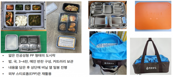 이번 사업에 쓰이는 다회용기 표준 도시락은 식판 형태의 스테인리스로 제작됐으며 별도의 받침에 올리고 뚜껑을 덮어 보온 가방에 담아 배송한다.