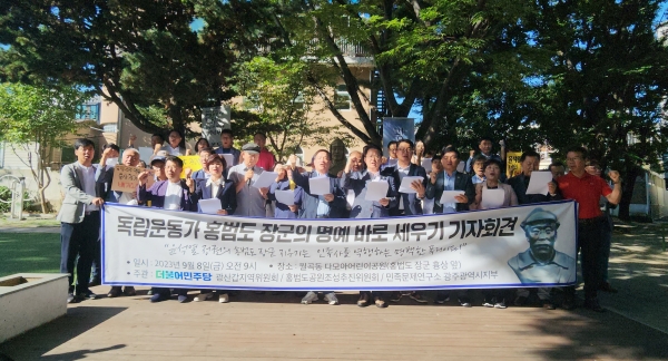 [Q뉴스] 더불어민주당 이용빈 국회의원 은 8 일 오전 9 시 광주광역시 광산구 월곡동 다모아공원 홍범도 장군 흉상 앞에서 육사의 홍범도 장군 흉상 이전과 친일사관으로 항일독립운동가 홍범도 장군의 명예를 실추시킨 윤석열 정부를 규탄하는 기자회견을 가졌다.