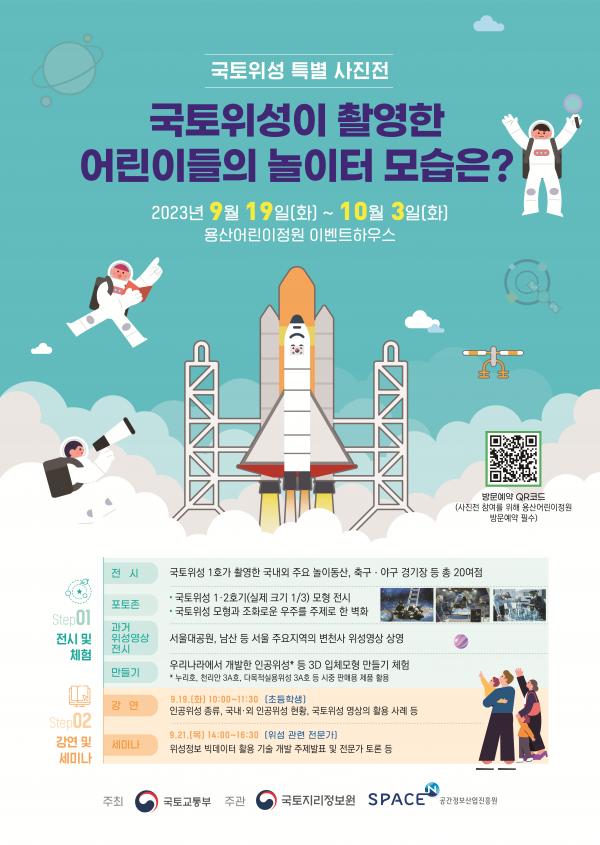 이번 사진전에서는 국토위성 1호가 2021년 10월부터 최근까지 국내외 주요 놀이공원, 축구 경기장, 유적지 등 어린이들을 위한 공간을 촬영한 총 20여점의 작품과 함께 국토위성 모형 및 우주 관련 벽화가 상설 전시된다.
