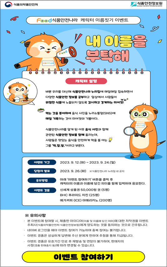 이번 공모전에는 국민 누구나 참여할 수 있으며 식품안전나라 누리집 공모전 이벤트 페이지에 접속해 미어캣 캐릭터 이름과 이름에 대한 설명 등을 작성해 제출하면 된다.