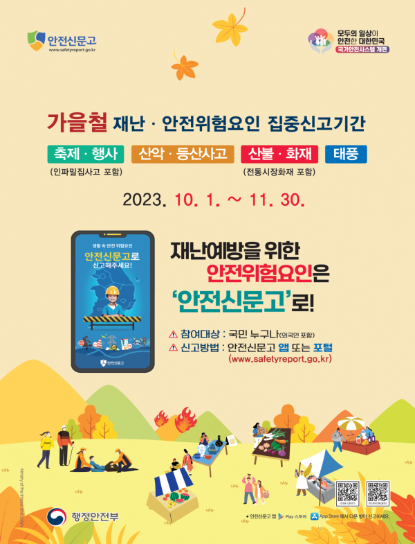박명균 예방정책국장은 “정부는 지자체와 함께 국민께서 안전신문고를 통해 신고해주시는 가을철 위험요인을 신속하게 조치해 국민의 안전한 일상을 만들어 나가겠다”고 말했다.
