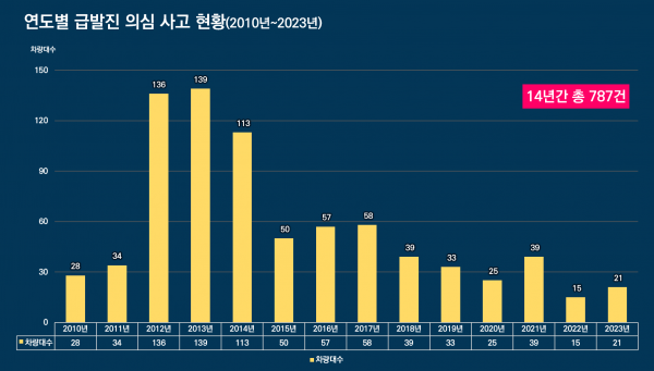 허영 의원이 한국교통안전공단 자동차리콜센터에 접수된 급발진 의심사고는 집계를 시작한 지난 2010년부터 최근까지 14년간 총 787건을 기록했다.