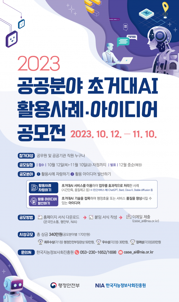 이에 행정안전부는 공공의 업무추진 과정에서 초거대 인공지능 기술을 활용한 사례와 아이디어를 발굴하고 확산하기 위해 공모전을 마련했다.