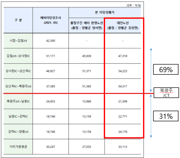 특히 대안 노선의 종점이 원안의 종점과 불과 차로 4분 거리의 동일 고속도로 선상인 점을 감안하면, 고작 3~4분 차이로 신규 교통량이 6,000여대 증가한다는 주장은 전혀 설득력이 없다고 강조했다.