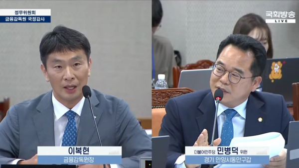 민병덕 의원은 “작년에 30년 만기 주택담보대출을 받은 대출자는 부당가산금리를 30년 동안 내야 하느냐”고 질문했고 이복현 금융감독원장은 “변동금리 구조와 시스템에서 은행들이 많은 이익을 얻고 있는 것은 사실”이라고 답했다.