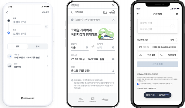 국민은 평소 자주 사용하는 민간앱에서 기차예매 서비스를 통해 출발역과 도착역을 검색하고 좌석선택 및 결제까지 이용할 수 있다.