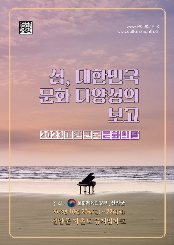 [Q뉴스] 문화체육관광부는 10월 ‘문화의 달’과 ‘문화의 날’을 맞이해 10월 20일부터 22일까지 전라남도 신안군 자은도에서 신안군과 함께 ‘문화의 달’ 기념행사를 개최한다.