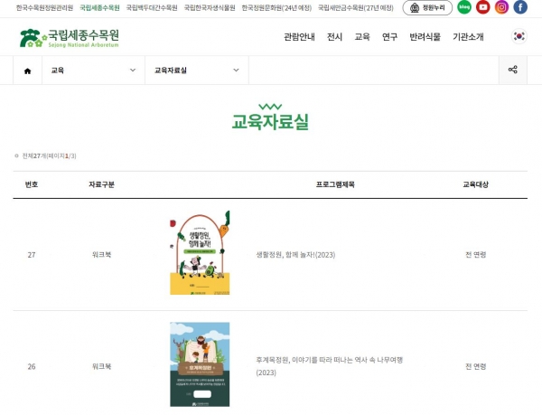 국립세종수목원은 홈페이지 온라인 교육 자료실을 통해 수목원·정원을 주제로 한 다양한 교육 자료를 제공한다.