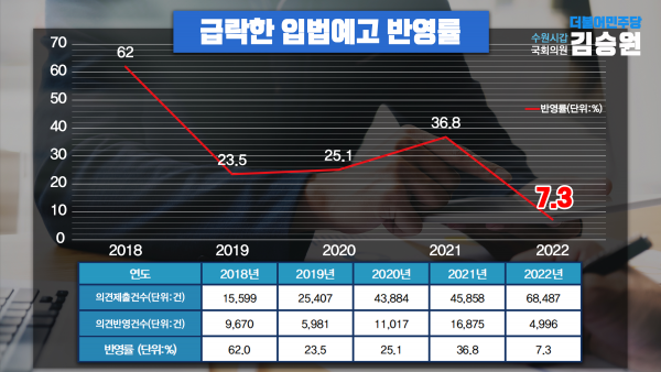 김승원 국회의원이 법제처로부터 제출받은 자료에 따르면 지난해 입법예고 기간 중 제출된 전체 국민 의견 6만8천487건 가운데 실제 반영된 의견은 4천996건으로 의견반영률은 7.3%에 그쳤다.