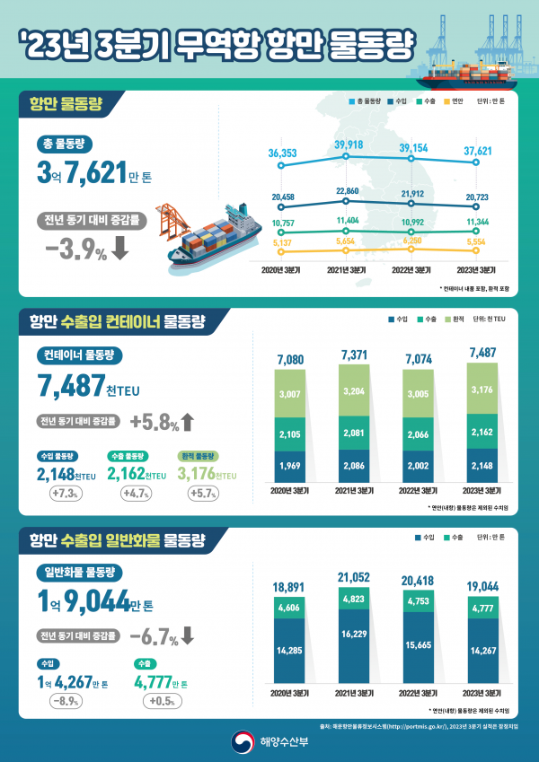 2023년 3분기 수출입 물동량은 전년 동기 대비 2.5% 감소한 3억 2,067만 톤으로 집계됐으며 연안 물동량은 전년 동기 대비 11.1% 감소한 5,554만 톤이었다.
