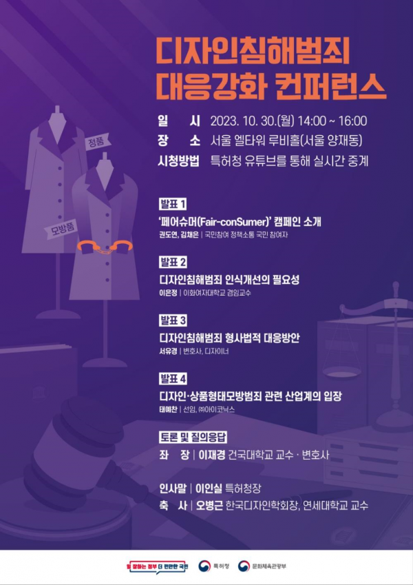 [Q뉴스] 특허청 기술디자인특별사법경찰은 디자인침해범죄 근절을 위해 10. 30. 오후 2시 엘타워에서 ‘디자인침해범죄 대응강화 학술회의’를, 11월 1일~11월 4일까지 코엑스에서 ‘디자인 가품 박람회’를 개최한다고 밝혔다.