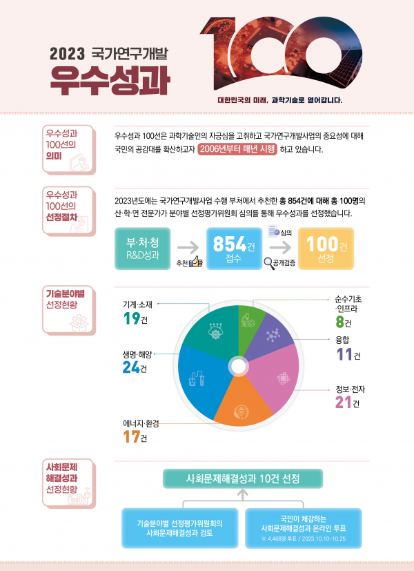 우수성과 100선은 국가 발전을 견인해 온 과학기술의 역할에 대한 국민들의 이해와 관심을 제고하고 과학기술인들의 자긍심을 고취하고자, 범부처적으로 우수한 국가연구개발 성과를 선정하는 제도로서 올해로 18년 차를 맞이했다.