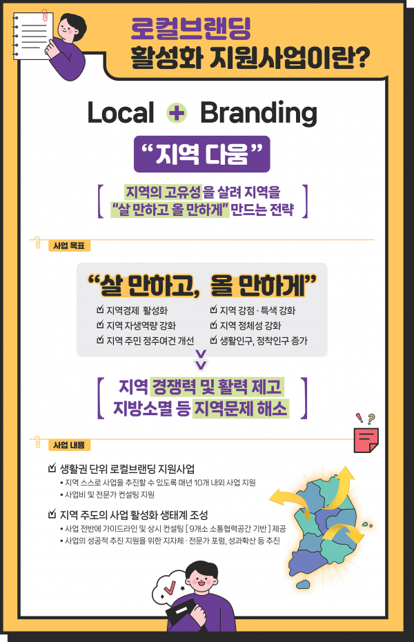 ‘로컬브랜딩 활성화’는 지역의 차별화된 고유성을 경쟁력의 원천으로 해 각 지역의 강점과 특색을 강화하고 이를 통해 지역을 생활권 단위로 ‘살만하고 올 만하게’ 만드는 사업이다.